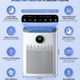 The purifier features a high-efficiency HEPA filtration system capable of capturing up to 99.97% of particles as small as 0.3 microns, including dust, pollen, smoke, pet hair, pet dander, odors, and other harmful airborne particles. The combination of a pre-filter, HEPA filter, and activated carbon filter ensures thorough purification and odor removal.