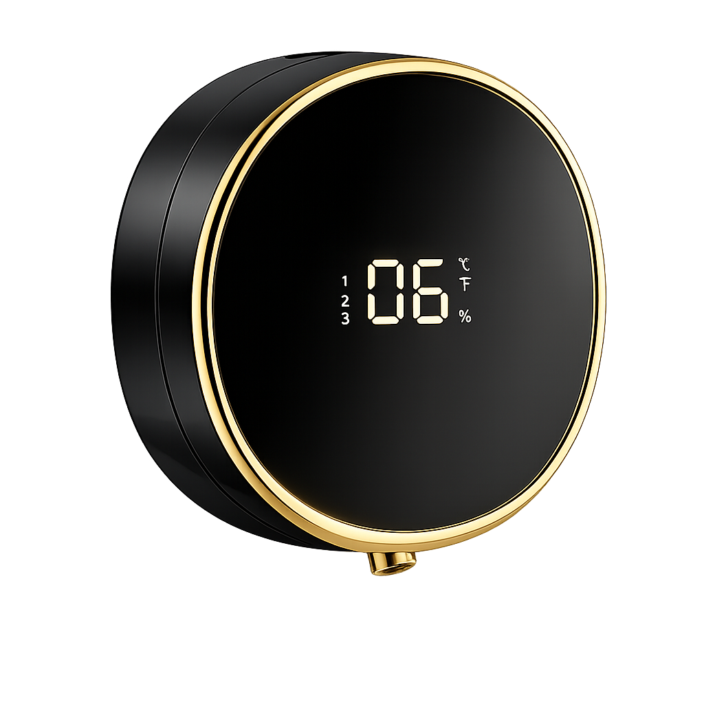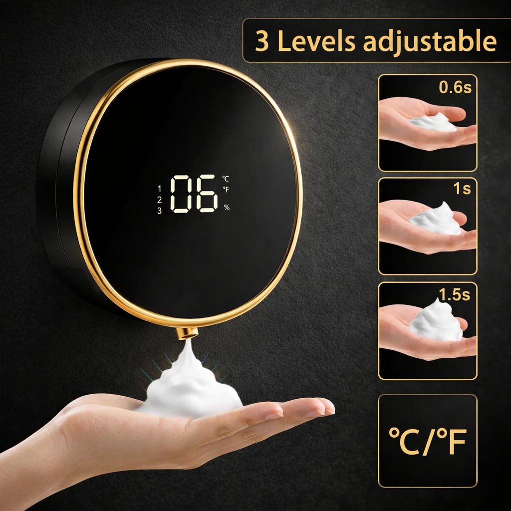 A modern hands-free soap dispenser with intelligent infrared sensing and adjustable foam levels. Features a built-in LED display showing temperature and battery status. Rechargeable, space-saving, and perfect for bathrooms, kitchens, and commercial spaces.