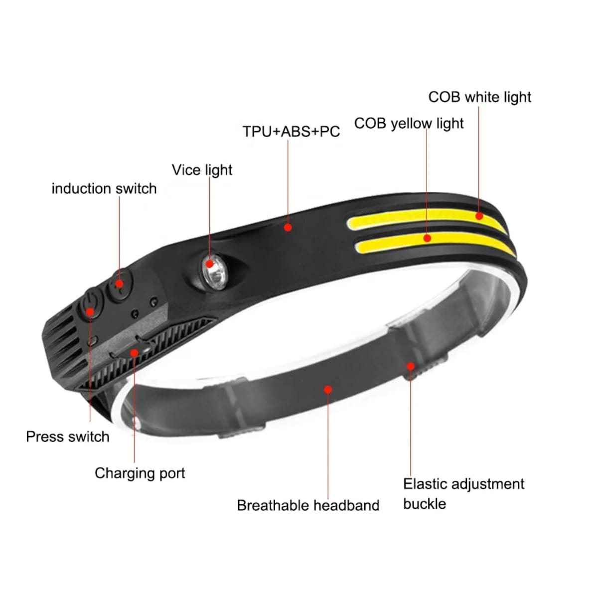 This headlamp features a motion sensor mode, allowing you to turn the light on or off with a simple wave of your hand-ideal when your hands are dirty or occupied. In addition to the wide COB light strip, it includes a side spotlight for focused lighting when you need extra visibility.
